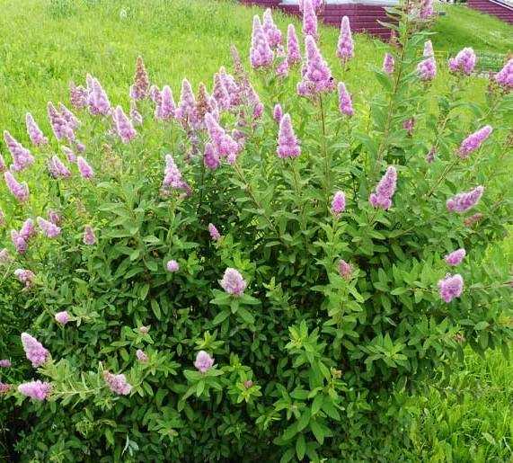Кустарник до 1,5 м высотой с прямыми красновато-коричневыми ветвями. Листья спиреи ланцетные, длиной до 10 см, снизу густо беловойлочные. Цветки темно-розовые, собраны в плотные верхушечные узкопирамидальные метелки. Цветет с июля, до сентября. Теплолюбивая спирея Дугласа может расти на одном и том же месте на протяжении 15 лет. Подбирая для неё участок, нужно учитывать такой фактор. Некоторое время допустимо, чтобы куст располагался в тени. Грунт по составу – нейтральный либо слабокислый. Растение на удивление морозостойкое, но чтобы сохранить свойственную ему декоративность, в первые зимы лучше укрывать его..