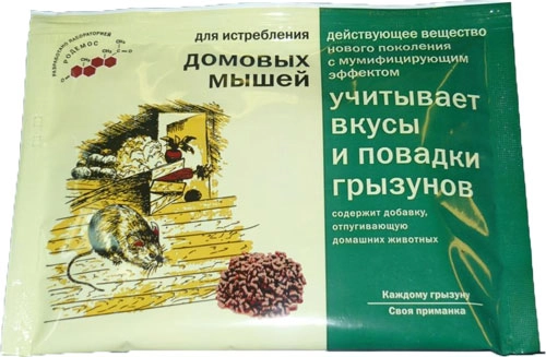 Разработанная с учетом вкусовых предпочтений мышей приманка в виде тесто-сырных брикетов. Предназначена для уничтожения серых и чёрных крыс, домовых мышей в помещениях и на открытой местности.