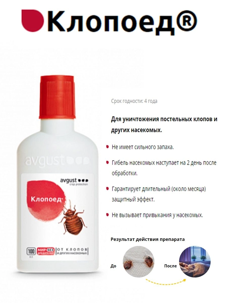 Смерть клопам, безопасность людям. Клопоед — препарат для уничтожения постельных клопов, тараканов, домашних муравьев, блох, мух и личинок комаров. ... Раствором препарата (100 мл/2 л воды) обрабатываются места обитания клопов: щели в стенах, полу и мебели, участки за плинтусами, подоконники, обратная сторона картин, ковров, места отхождения обоев и т.п. Обработка проводится одновременно во всех помещениях, где обнаружены клопы, и в помещениях, смежных с ними, с целью предотвращения возможного расселения насекомых.