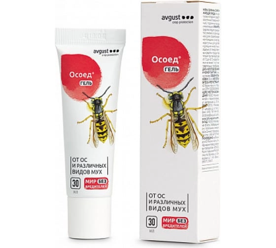 Гель от ос и различных видов мух "Осоед", туба 30 мл.. Преимущества средства от насекомых: насекомые погибают в течение нескольких минут после контакта со средством; инсектицид содержит пищевые добавки, привлекающие насекомых; можно использовать в виде пасты для обработки оконных рам и плафонов. Действующее вещество средства от мух и ос: 0,5% имидаклоприда. Обрабатываемый объект: кухни, летние террасы, беседки и другие помещения. Вредный объект: все виды мух.