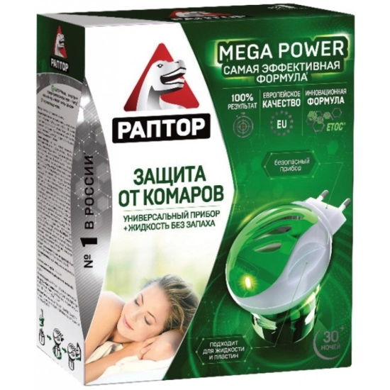 Комплект Раптор фумигатор и жидкость от комаров -эффективное средство от комаров. "Раптор" представляет собой работающий от обычной сети 220В миниатюрный прибор, основой которого является нагревательный микроэлемент. В фумигатор вставляются сменные картонные пластины или баллончик с жидкостью. Термоэлемент фумигатора РАПТОР нагревает стержень флакона с жидкостью или пластину, приводя к испарению жидкости. Концентрация действующих веществ в воздухе становится достаточной для уничтожения всех комаров и мошек, но остается абсолютно безвредной для человека и домашних животных.