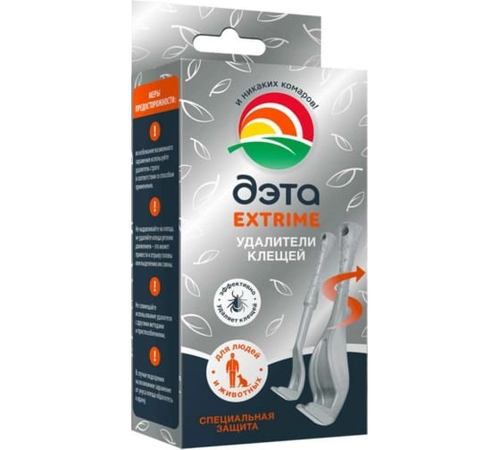 Выкручиватель клещей, инструмент для удаления клещей у людей и животных ДЭТА EXTRIME — необходимый инструмент для самостоятельного удаления паразитарных клещей с тела человека или животного при прогулках в лесу или других местах возможного заражения клещами.Удаляет клеща полностью, не оставляет его фрагментов в коже. Не сжимает клеща, уменьшая риск инфицирования. Удаляет клеща без боли и повреждений.В наборе 2 удалителя разных размеров для простого и быстрого извлечения клеща любого размера.