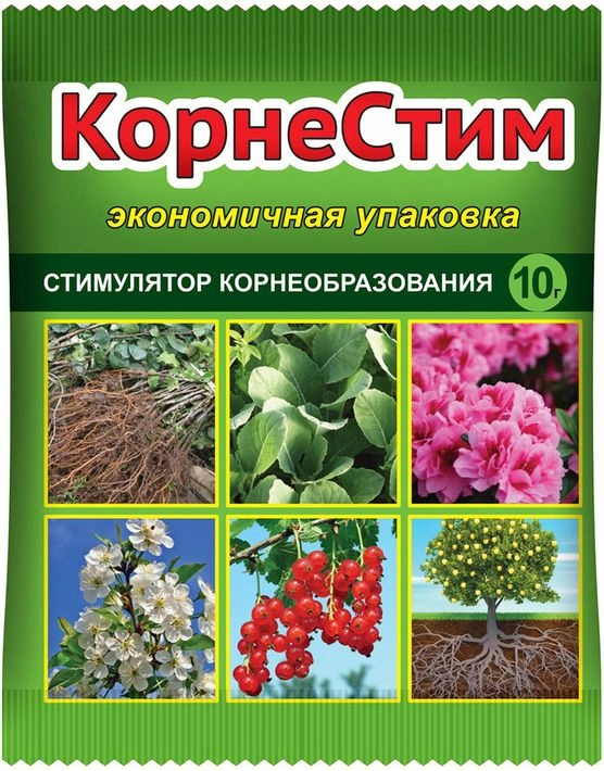 КорнеСтим - стимулятор корнеобразования, улучшает укоренение черенков и саженцев плодовых, ягодных, хвойных и цветочно-декоративных культур, рассады овощей и цветов. Препарат применяют опудриванием или в виде водного раствора.
