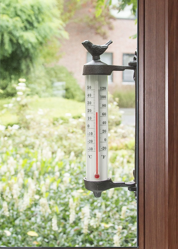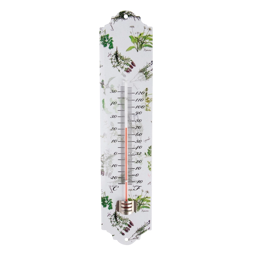 Термометр Esschert Design HD10 изготовлен из металлической пластины, удобной для подвешивания, покрытой эмалью и декорированной цветочными и травяными рисунками, а также самого стекла. На термометре указаны измерения Цельсия и Фаренгейта.