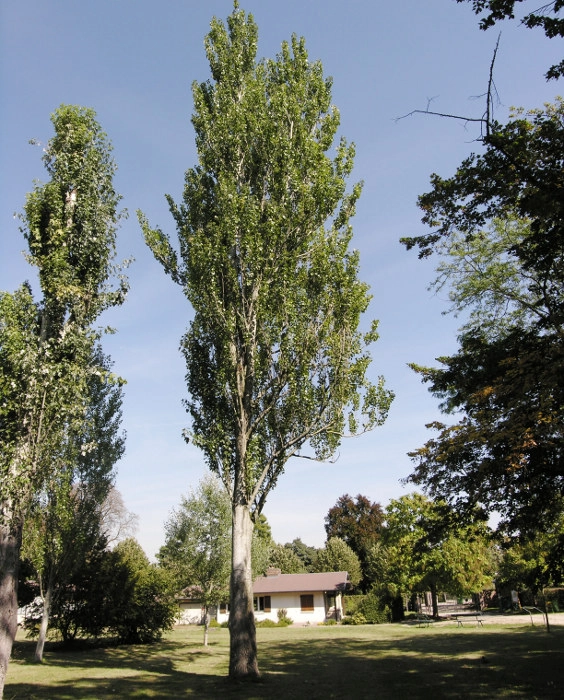 Крона узкоколонновидная. Кора ствола серебристо-серая, гладкая, у взрослых деревьев у основания ствол темно-серый, слаботрещиноватый. Листья 3-5-лопастные, кожистые, темно-зеленые сверху, снизу - опушенные, серебристые, осенью - желтые.