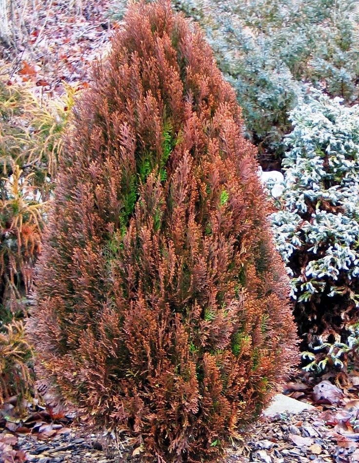 Растёт очень медленно. Годовой прирост составляет всего 5 - 7см. Во взрослом возрасте достигает в высоту 140-150 см. При этом ширина кроны – до 0,9 м. Плохо переносит пониженные температуры. Характерная особенность при зимовке меняет окраску на медно коричневую. Весной с началом теплоты вновь преобретает зелено - желтый цвет. Зимой нуждается в укрытии.