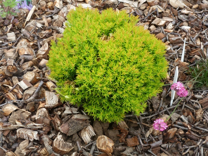 Карликовый шарообразный кустарник до 0,7м высотой и до 0,9м в диаметре. Хвоя золотистая, зимой с бронзовым оттенком, молодые приросты ярко-желтые. Растет медленно. Годовой прирост составляет около 5-6 см. К почвам нетребовательна, предпочитает свежие, достаточно увлажненные дренированные плодородные суглинки с слабокислой реакцией. Светолюбива. В тени хвоя желто-зеленая. Рекомендуется посадка в местах с легкой полутенью и достаточной влажностью почвы. Для небольших садов, альпинариев или вересковых садов. Миниатюрный кустарник хорошо смотрится в качестве солитера в цветнике или в миксбордере. Отлично подходит для создания низких свободно растущих живых изгородей и бордюров, для создания контрастных композиций из деревьев и кустарников с различной архитектурой. Подходит для выращивания в контейнерах для украшения балконов, крыш домов или террас. Хорошо переносит условия города. Зимостойкость: Зона 4 (до -29ºС).