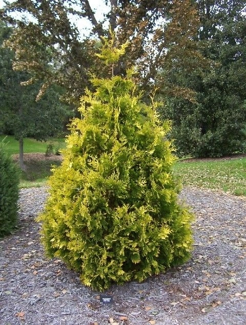 Туя западная Аурео-спиката декоративна окраской хвои и формой кроны. Молодые приросты создают золотистую "ауру" вокруг растения.