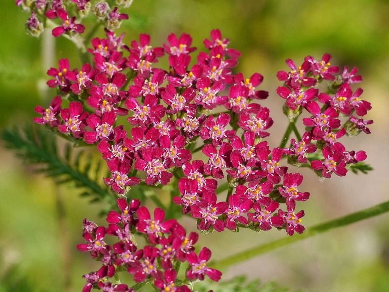 это яркое растение, которое много лет растет на одном месте и не требует особого ухода. Цветки по форме напоминают маленькие корзинки 0,7 см в диаметре, которые собраны в плотные щитковидные соцветия очень насыщенного малинового цвета. Период цветения начинается в июле и длится 40-45 дней