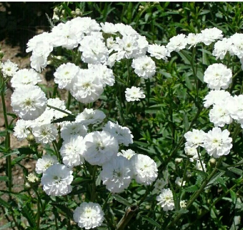 Белый красивоцветущий садовый многолетник. Цветет в июле-августе махровыми чисто-белыми цветками-шариками. Высота белого тысячелистника 60-70 см. Листья цельные, а не рассеченные на множество тонких долей. Местоположение солнечное.
