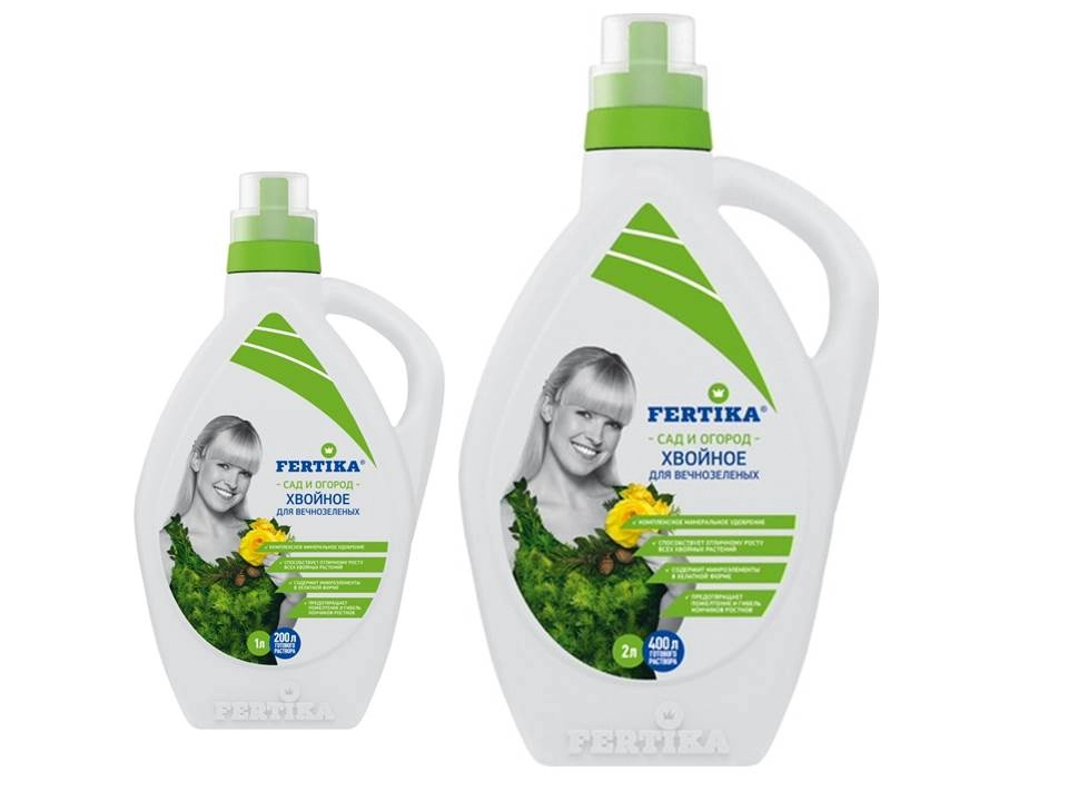 Жидкое комплексное минеральное удобрение для подкормки всех видов хвойных культур, а также для растений, предпочитающих кислую почву: рододендронов, азалий, гортензий, альпийской розы, вересков, садовой черники, голубики и др.
