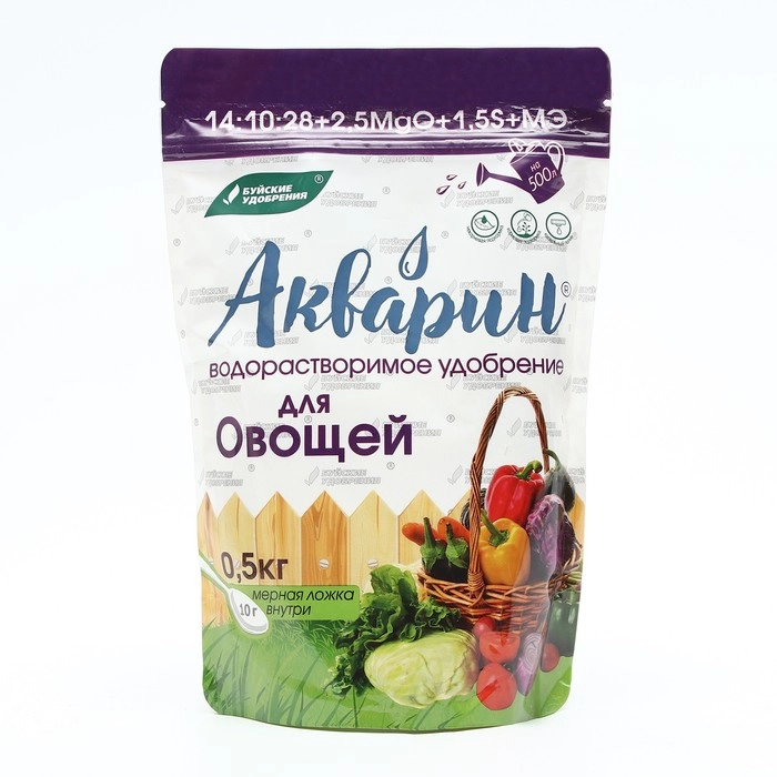 Акварин Для овощей - водорастворимое удобрение, в состав которого входит азот, фосфор, калий, магний, сера и микроэлементы – железо, цинк, марганец, медь в хелатной форме, а бор и молибден – в минеральной. Благодаря кислой реакции (рН) удобрения, оно легко растворяется в холодной воде и более эффективно усваивается корневой системой или листовой поверхностью растений.