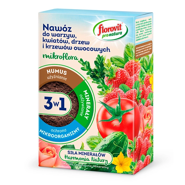 Удобрение Флоровит (Florovit) PRO NATURA MIKROFLORA «3 в 1» для овощей – современное комплексное гранулированное органоминеральное средство для подкормки овощей, цветов, фруктовых деревьев и ягодных кустарников. Удобрение содержит натуральные органические вещества, улучшающие качество почвы (повышает плодородие) и минералы, необходимые для правильного роста и развития растений. Состав соединений гумуса удобрения аналогичен гумусу, содержащемуся в натуральном компосте или навозе.