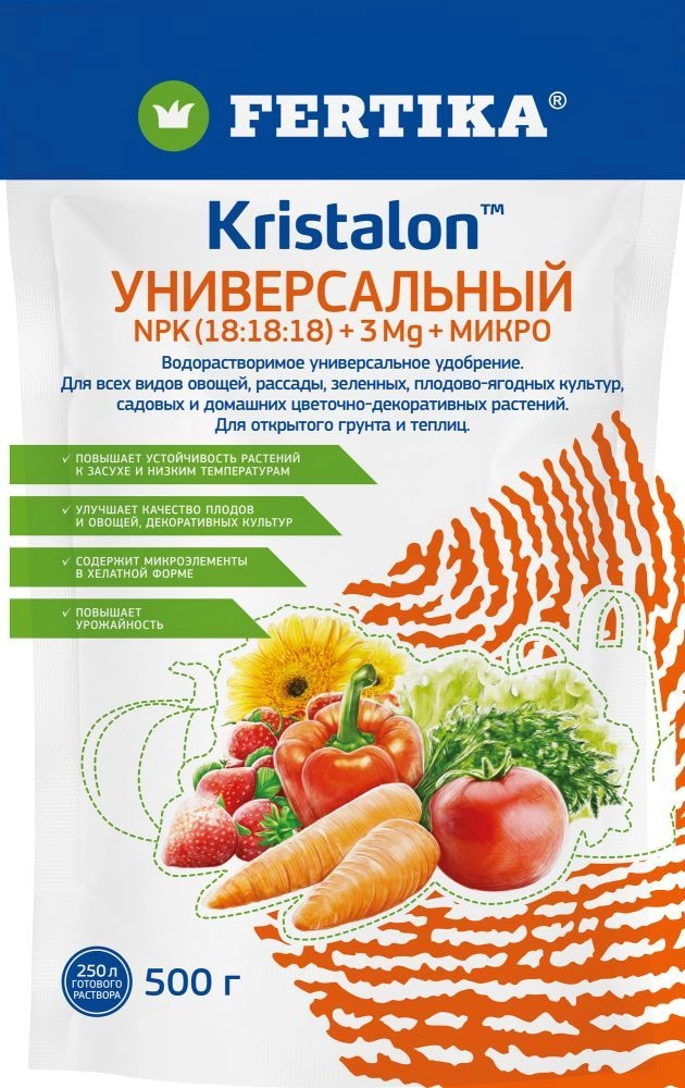 Полностью водорастворимое комплексное азотно-фосфорнокалийное удобрение, содержащее микроэлементы. Предназначено для широкого использования при выращивании всех овощных и цветочных культур в открытом грунте и теплицах. Обеспечивает дополнительными питательными веществами в разные фазы развития с/х культур, повышает энергию и силу роста, устойчивость растений к засухе и низким температурам, компенсирует недостаток питательных элементов в течение неблагоприятных условий роста, когда потребности растений превышают поглощающую способность корневой системы. Применяется в период вегетации растений.