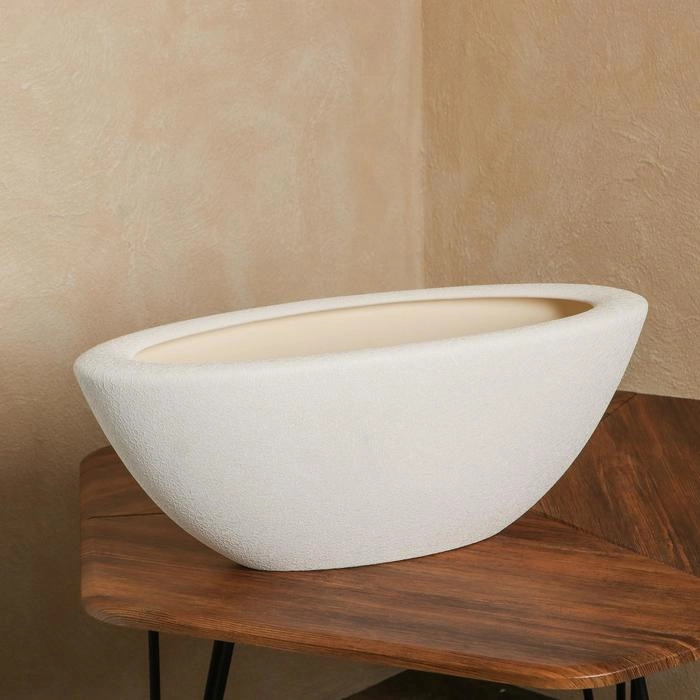 Кашпо для комнатных растений из керамики в форме ладьи с матовой поверхностью. На корпус кашпо нанесен рисунок в виде паутинки.Можно посадить различные комбинации растений и использовать чашу в разнообразных вариантах применения.
