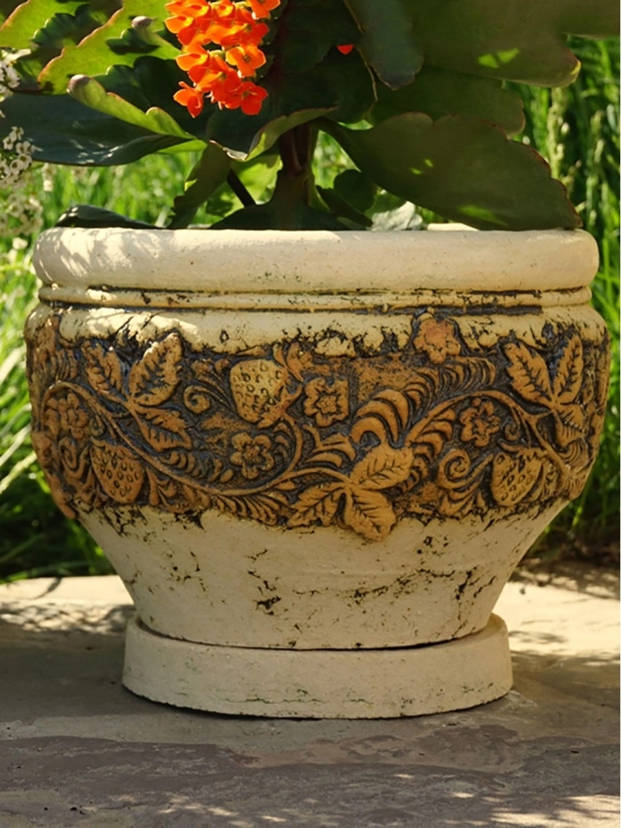 Горшок для сада изготовлен из шамотной глины высокотемпературного обжига. Изнутри покрыт специальной кварцевой глазурью. Выполнен в бежевом цвете с коричневым в области декора. Декорирован узорами из линий, имитирующими лёгкие трещинки под старину.