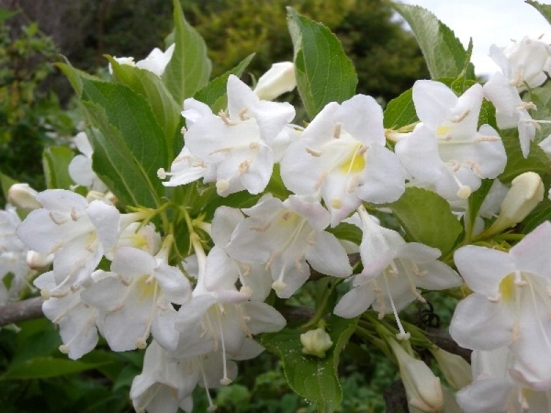 Декоративный лиственный кустарник, достигающий всего 1, 5 метра в высоту. Отличительной особенностью данного сорта являются вертикальные побеги, которые с возрастом могут изгибаться до земли. Они полностью покрыты ярко – зелёными, достаточно длинными листьями с характерными жилками. На таком фоне, очень эффектно выглядят белоснежные цветки, которые распускаются дважды в год: в июне и августе. Для увеличения декоративности и продолжительности цветения, вейгелу высаживают на солнечных участках, но и в полутени кустарник способен благополучно расти и развиваться. Она лучше всего растет в легкой полутени или на солнцепеке, но при этом должна быть защищена от сильных ветров. Почва для вейгелы должна быть плодородной и влажной. Растение обладает хорошей зимостойкостью и способностью выживать в условиях USDA зоны 5 (от -29° до -23°).
