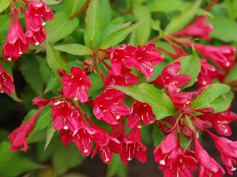 Небольшой кустарник, выведенный в результате скрещивания других дикорастущих сортов: вейгелы корейской и вейгелы обильноцветущей. Широкий раскидистый кустарник не занимает много места на участке и гармонично вписывается в любой ландшафтных дизайн. Особенно прекрасна вейгела в период цветения, когда на пряморастущих побегах появляются рубиновые цветки колокольной формы. Отличается сорт своим продолжительным цветением (до 20 дней), а также возможностью цвести 2 раза в год. Изящные цветки не только восхитительно выглядят на фоне светло – зелёных заостренных листьев, но и источают нежный приятный аромат. Устойчивость к болезням и вредителям, неприхотливость, хорошая зимовка под снегом, чувствительность к сильному ветру, не слишком хорошая устойчивость к засухе. Высаживается на хорошо освещенных, теплых и солнечных участках. Вейгела – влаголюбивый кустарник.