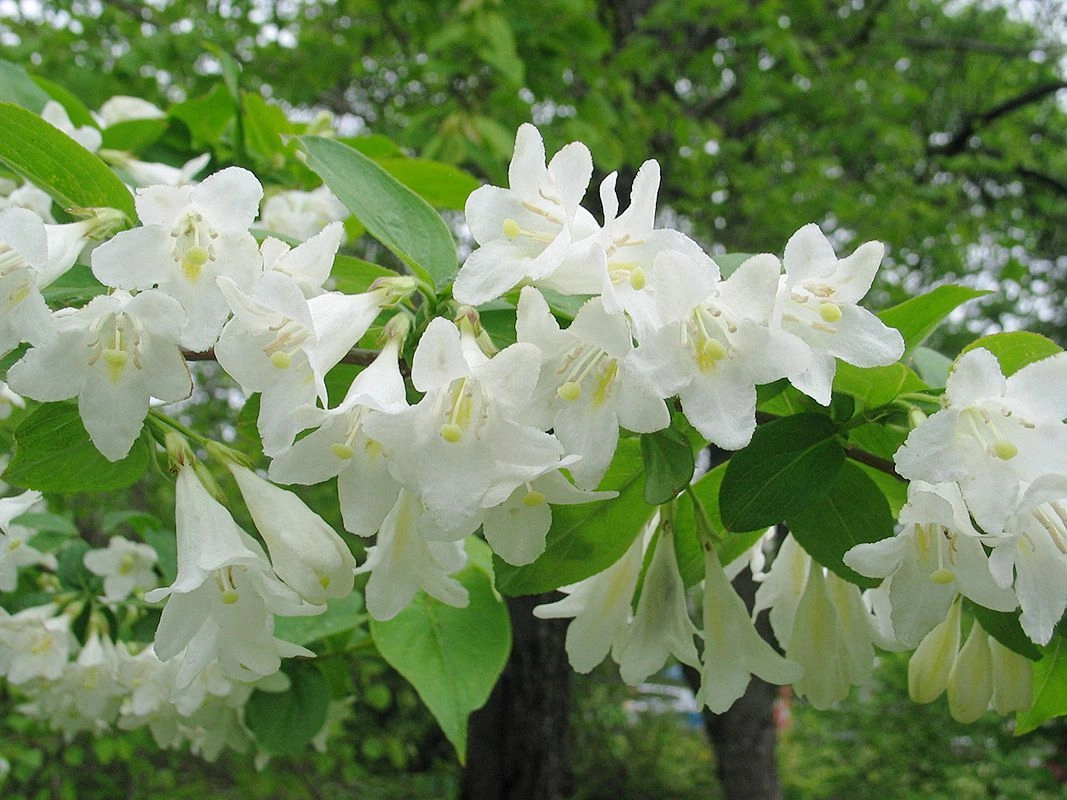 Вейгела цветущая «Альба» (Weigela florida 'Alba') — высота куста 3 м, диаметр кроны около 3,5 м. Цветки белые, розовеющие при отцветании. Листья с белыми крапинками. Цветение: длительное цветение – с конца мая до первых чисел июля, куст покрывается облаком из белых колокольчиков, от которых исходит слабый, но приятный аромат. Освещение: необходимо располагать на солнечном участке. Вейгела хорошо растет на плодородных, рыхлых почвах, но не выносит переувлажнения. Она влаголюбива, но поливать взрослые растения необходимо только в засушливый период, выливая под каждый куст большое количество воды. Зимостойкость у данной вейгелы средняя. Она выдерживает холода до -23 градусов (6 зона морозостойкости). Перед наступлением первых сильных холодов насаждения нужно укрыть. Для этого можно использовать высушенные хвойные ветки, специальный укрывной материал (например, лутрасил).
