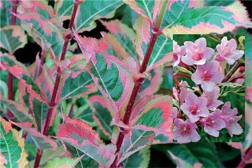 Необычайно красивый довольно новый сорт вейгелы. Листья зеленые с кремово-желтой каймой летом, осенью кайма становится красной. Цветы розовые. Размер взрослого растения около 120х120 см. Карликовый, фантастически красивый, сорт. Куст густой, плотный, округлой формы. Время цветения: третья декада мая -начало июня. Продолжительность цветения 20 дней. Вейгела цветущая может расти как на солнце, так и в полутени. Предпочитает влажные, плодородные и желательно слабокислые почвы. Не выносит застоя воды. Растет быстро. При засухе нуждается в поливе. Используется в одиночных, групповых и опушечных посадках. Подходит для кашпо и малых садов. Зимостойка до -30.