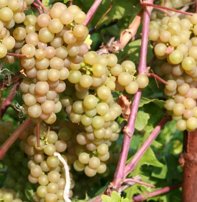 Грозди цилиндро-конические, средней, величины, массой 200 г, умеренно-плотные. Ягоды средние, массой 2 г, округлые, белые, на солнце с розовинкой.
