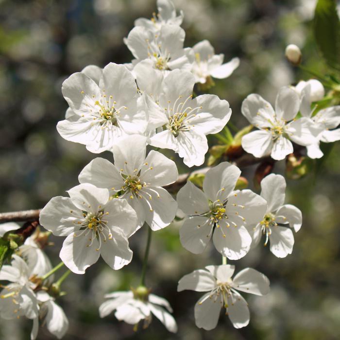 Цветки белые, душистые, до 2,5 см. в диаметре, по 2 — 4 на длинных голых цветоносах в зонтиковидных соцветиях. Цветет в конце апреля—мае. Цветки появляются одновременно с распусканием листьев. Продолжительность цветения 10 - 20 дней.