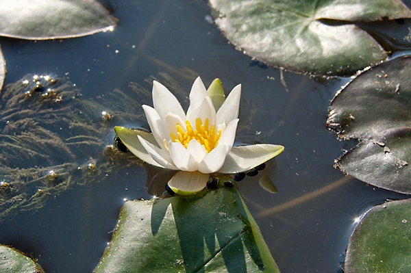 Цветки белые звездчатого типа, тычинки желтые. Цветки около 2,5 — 3 см в диаметре. Среднее количество лепестков 10 — 15. Самая маленькая нимфея среди белых. Листья темно — зеленого цвета, почти круглые, около 5 см в диаметре. Относиться к карликовым кувшинкам, подходит для выращивания в мини прудах, вазонах и различных емкостях. Начинает хорошо цвести только на 2 — 3 год, когда разрастется.