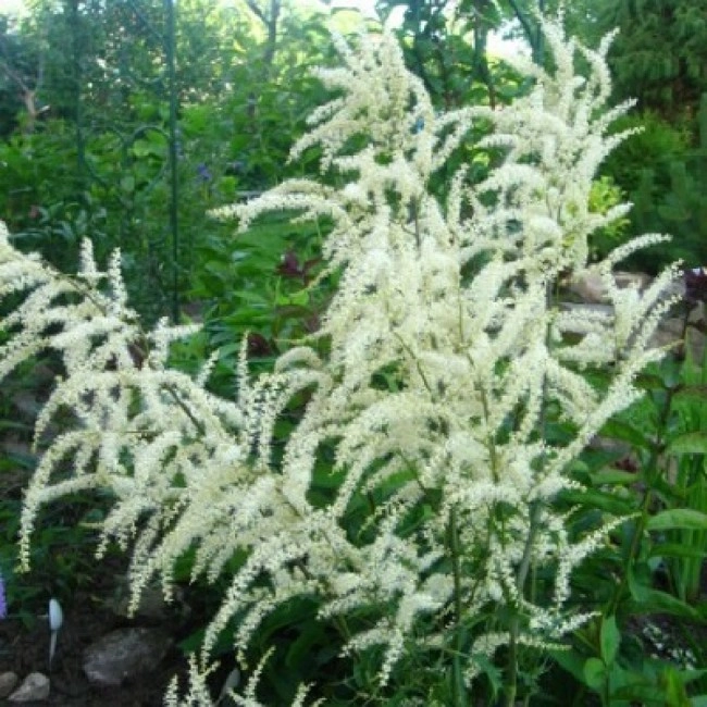 Волжанка двудомная Неффи — цветки мелкие, белые, собраны в метельчатое, раскидистое соцветие. Высота растения до 60 см с рассеченными на мелкие доли, несколько поникающими листьями.