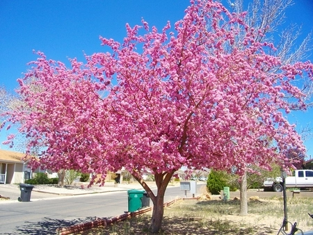 Цветки бело-розовые, собраны в соцветия зонтиковидной формы. После цветения появляются небольшие плоды. Яблоки диаметром до 3 см, с красной яркой кожицей.