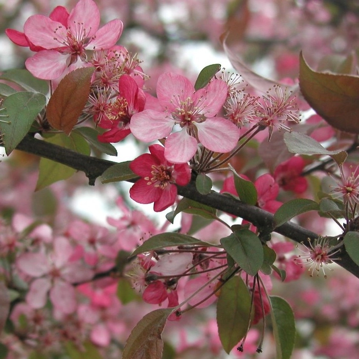 Листва фиолетовых оттенков с весны до осени. Обильное цветение в мае карминово-розовыми цветами размером 2-3 см. Плоды тёмно-красные, долго сохраняются на дереве.