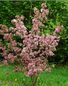 Листья при распускании красные, постепенно зеленеющие. Цветки крупные, розовые с белым. Плоды темно-красные, до 3 см в диаметре, со слабым восковым налетом.