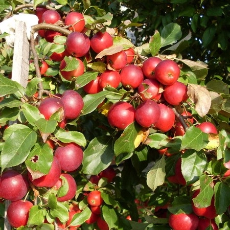 Листья яйцевидные темно-зеленые, блестящие, крепкие, при распускании имеют бронзовый оттенок. Цветки сиреневато-пурпурные или темно-сиреневые, крупные, простые. Цветет в мае. Плоды шаровидные, красные, иногда с оранжевым бочком.