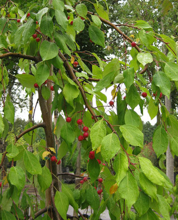 Листья зеленые, блестящие, осенью - коричневато-оранжевые или желтые. Бутоны насыщенно розовые, цветки белые, довольно крупные - размером 3-4 см. Цветение обильное. Плоды мелкие, размером 1-1,5 см.