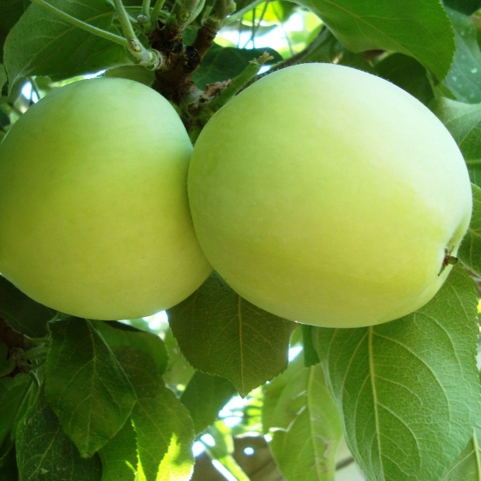 Плоды молодого дерева более крупные, весом до 150 г. Спелые яблоки светло-желтого цвета с зеленоватым оттенком.