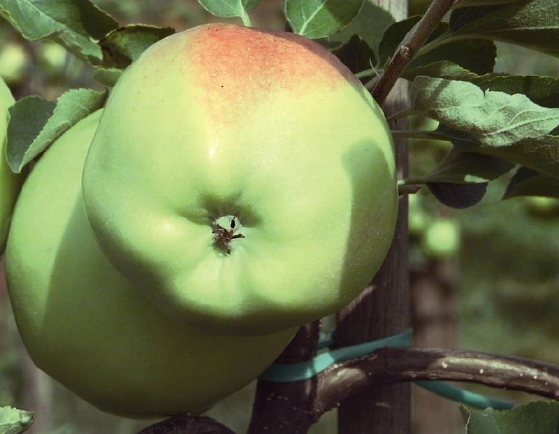 | Плоды | Плоды крупные, 145-200 г., уплощенно-округлой формы, располагаются по одному-два. Окраска плода в момент съемной зрелости: основная – зеленоватая или зеленая, покровная – в виде небольшого буровато-красного румянца, усиливающегося при хранении. Кожица плотная, гладкая. |