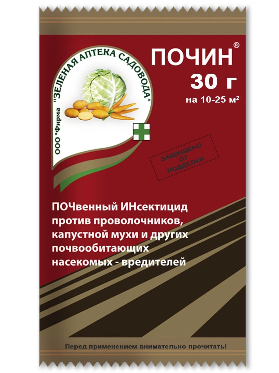 Средство «Почин» поможет уберечь урожай от проволочника, капустной мухи, крестоцветных блошек, личинок хрущей и прочих опасных почвенных насекомых. Благодаря удобной и продуманной форме выпуска препарат очень удобен в применении.