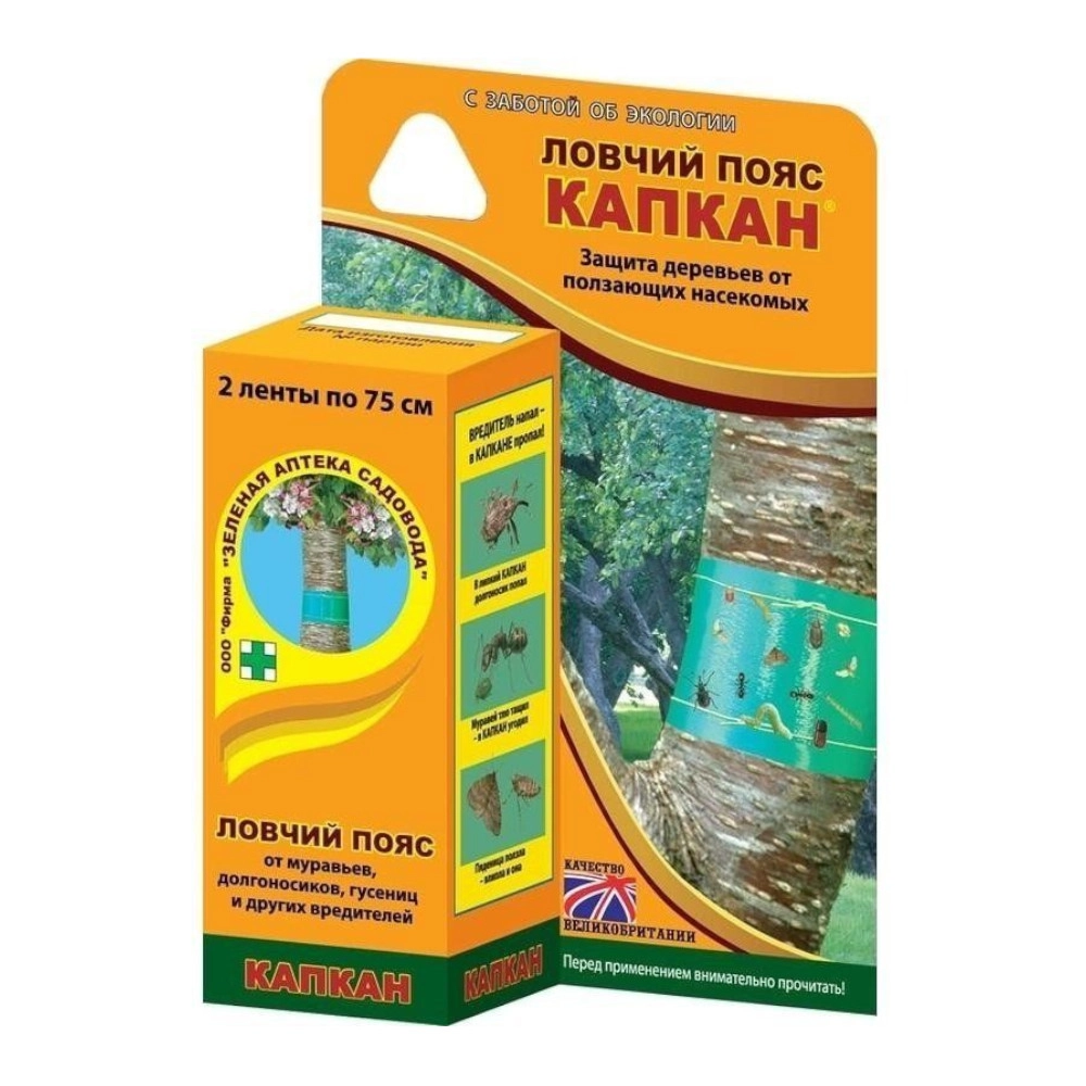 Клеевая ловушка Ловчий пояс Инта Вир -эффективное надежное средство, которое защитит ваши декоративные и плодовые деревья от ползающих насекомых-вредителей (муравьи, гусеницы, тля, моль и д.р.) Представляет собой клейкую ленту, садясь на которую насекомые не могут выбраться и через короткое время погибают. Данная ловушка является безопасной для полезных насекомых, так как имеет зеленый цвет, который не является для них привлекательным. Характеристики товара: Длина: 75 см, Рекомендации по применению: подготовьте предварительно кору деревьев, сделав ее гладкой и обхватите лентой с нахлестом примерно в 3 см.